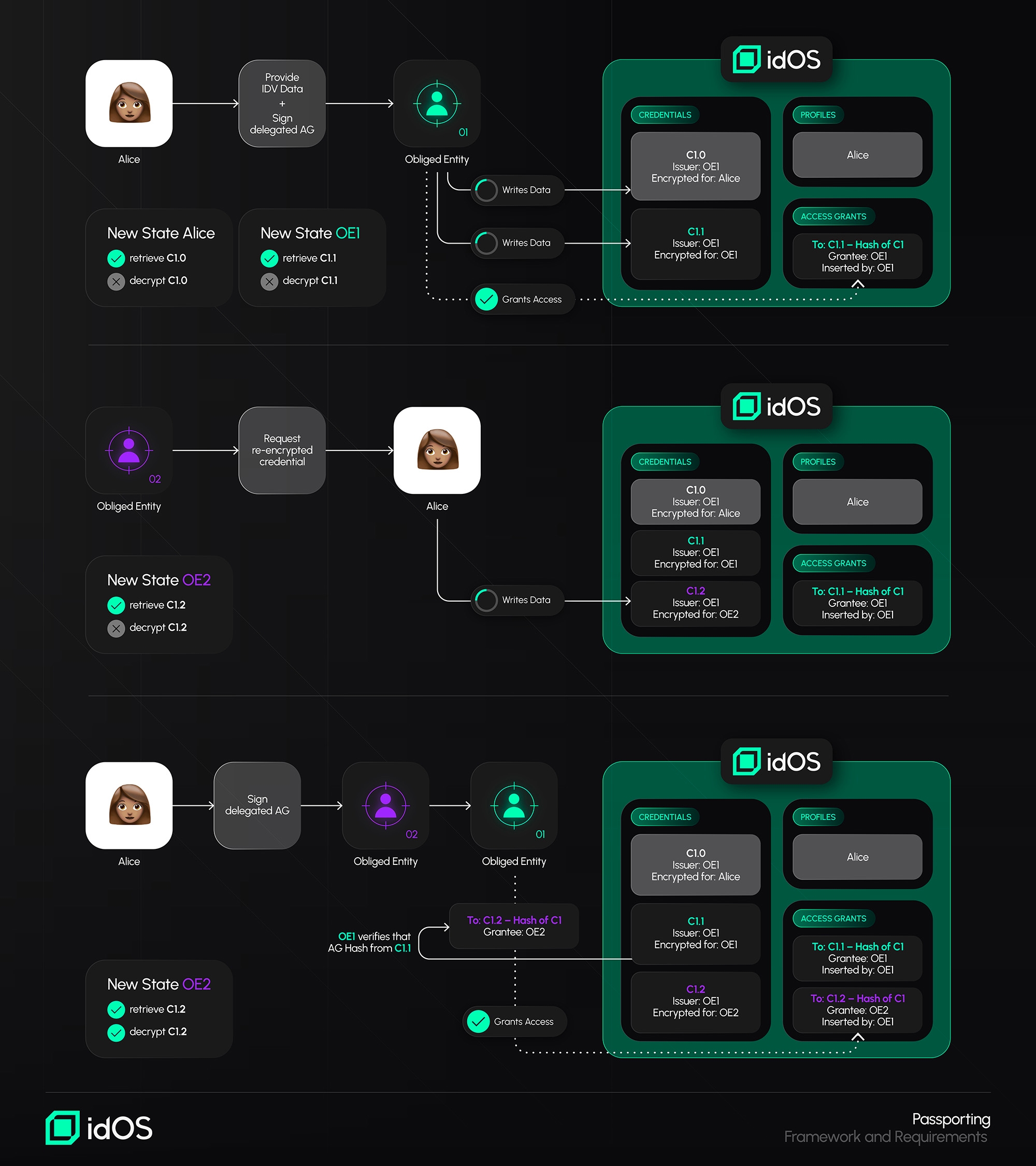 Credential Sharing: The user creates an encrypted copy of the credential for the relying obliged entity (e.g. because it wants to onboard to such entity's services) and shares an Access Grant with the relying obliged entity. Since this relying obliged entity wants to benefit from Passporting, it does not insert the Access Grant directly into idOS but forwards it to the obliged entity relied upon, much like a request from an entity to the other.