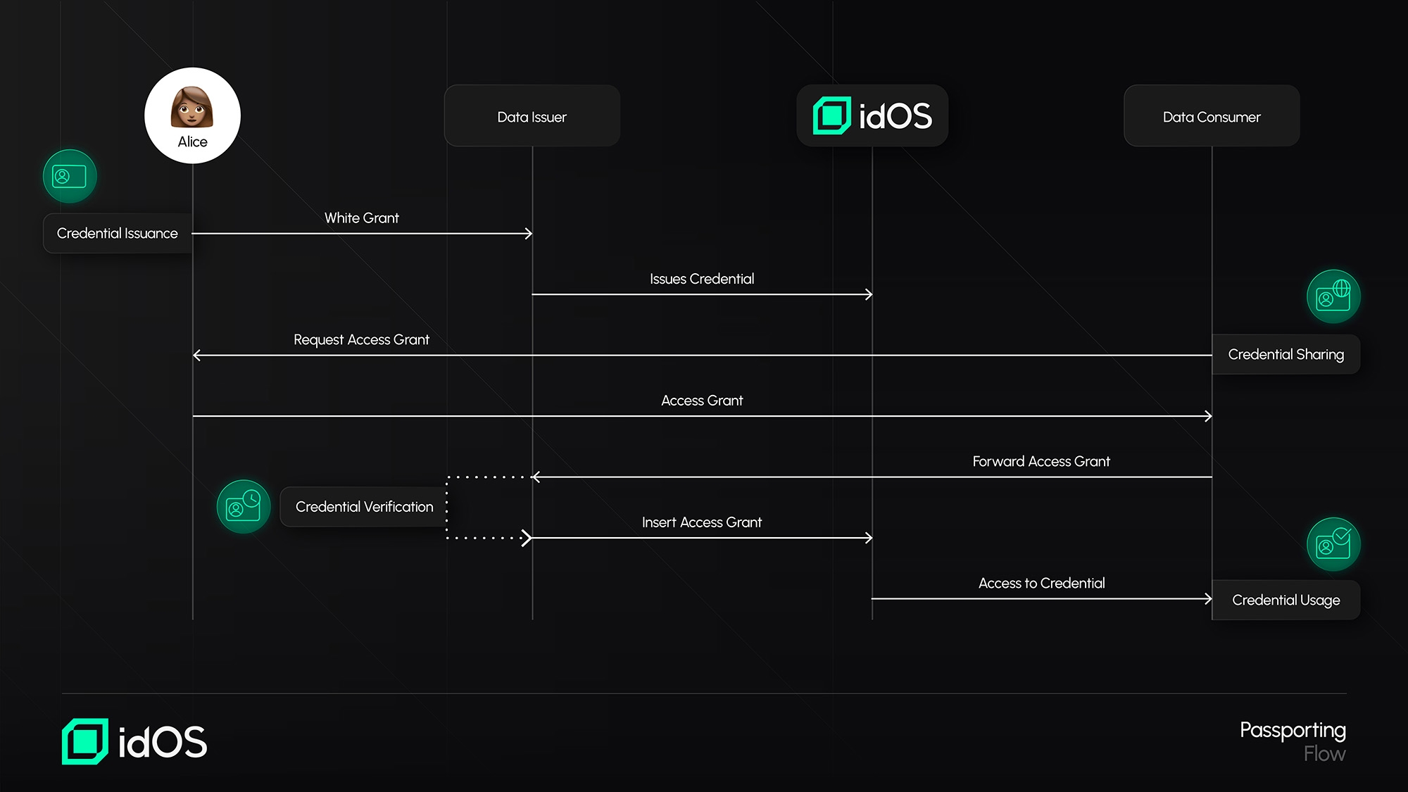 Credential Issuance: The obliged entity being relied upon issues a credential to a user within idOS after the user has gone through KYC in the context of the obliged entity relied upon (with the user's agreement upon a Write Grant). It is relevant to highlight that any Access Grant contains a Hash or Signature to the clear-text content of the Credential and that Credentials may be revoked by its issuer.