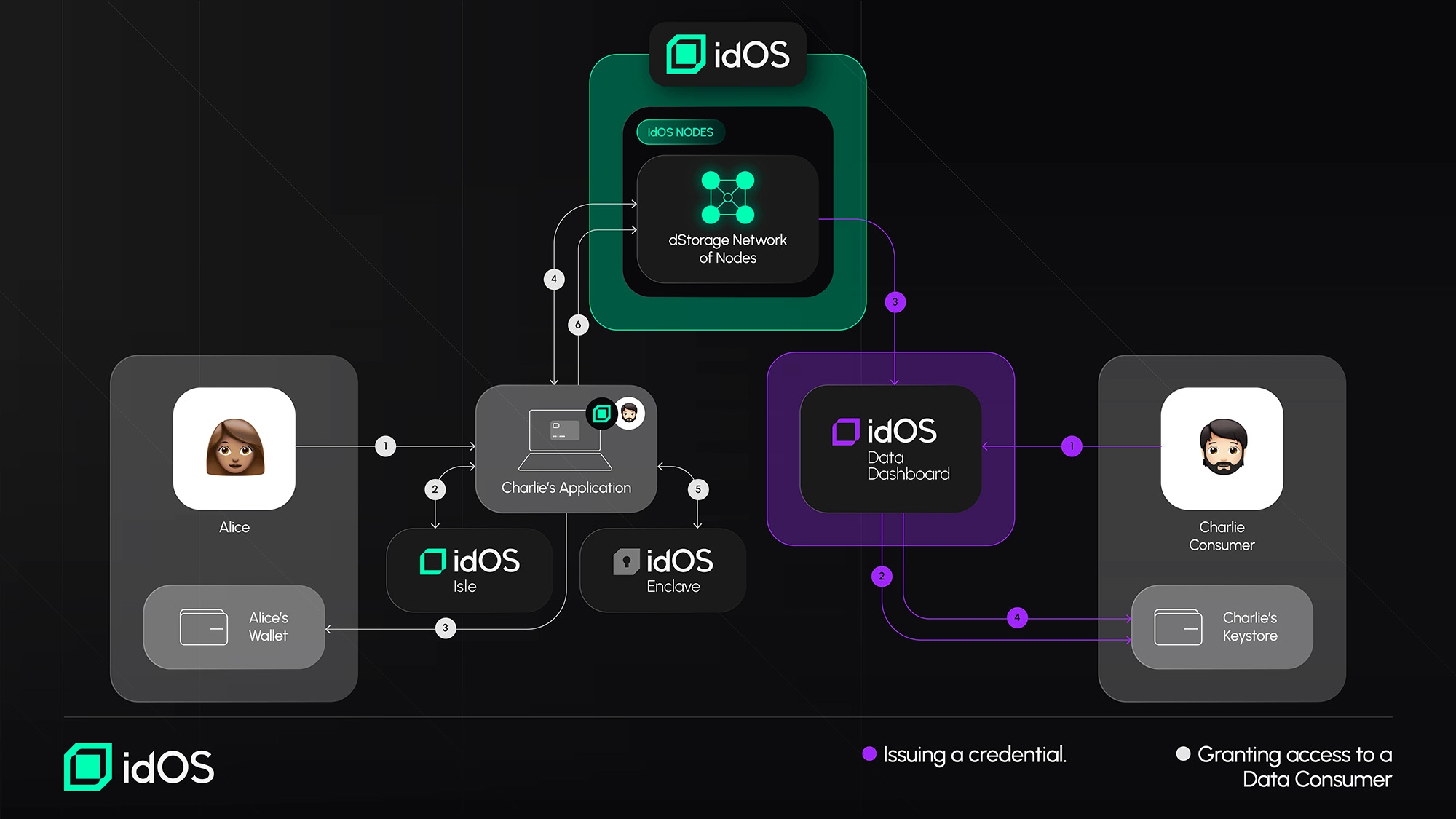 (A) Granting access to a Data Consumer: Alice grants Bob access to her data by (1) going to a integrated idOS Issuer or Consumer Application, optionally interacting with the idOS Isle (2), creating an access grant and (3) approving the transaction in her wallet. The Access Management Protocol is (4) updated, which in directly updates the idOS nodes. The encrypted credential is retrieved from the idOS, decrypted via the idOS enclave (5), reencrypted for the recipient (Charlie) and placed back into the idOS (6). Charlie can now see Alice’s data on a dashboard, and/or get it from a node. (see next flow) (B) Retrieving Credential via the idOS Data Dashboard: Charlie can now (1) go to his data dashboard, (2) sign a message in his wallet and (3) see Alice's data that the dashboard dApp retrieved from the idOS (unless Alice revokes the grant or deletes the data before). The retrieved data needs to be decrypted (4).